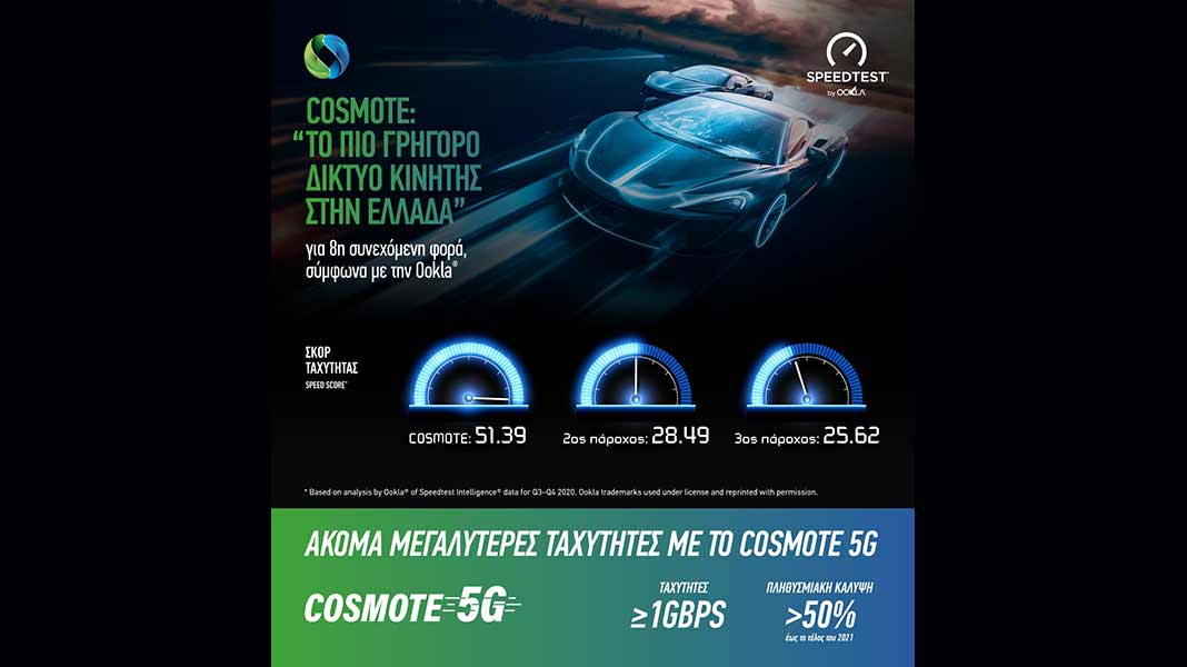 Το βραβείο για «το πιο γρήγορο δίκτυο κινητής στην Ελλάδα», απέσπασε και πάλι το δίκτυο COSMOTE κινητής στα Speedtest AwardsTM της Ookla®, της πρώτης εταιρείας παγκοσμίως για μετρήσεις broadband και mobile internet. Η COSMOTE, που έφερε πρώτη στην Ελλάδα το 5G, το Internet του μέλλοντος, βραβεύτηκε για όγδοη συνεχόμενη φορά από την Ookla® πετυχαίνοντας σκορ ταχύτητας (Speed ScoreTM) 51.39, (2ος: 28.49 και 3ος: 25.62) και οι ταχύτητες download μετρήθηκαν κατά 64% υψηλότερες από εκείνες του δεύτερου παρόχου και 83% υψηλότερες από του τρίτου.