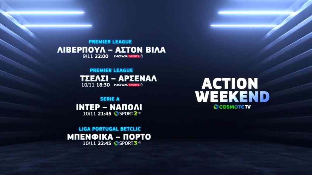 Από το τηλεοπτικό «μενού» της COSMOTE TV ξεχωρίζουν, επίσης, τα ματς Κάλιαρι-Μίλαν (9/11, 19.00, COSMOTE SPORT 3HD) Γιουβέντους-Τορίνο (9/11, 21.45, COSMOTE SPORT 3HD) και Αταλάντα-Ουντινέζε (10/11, 13.30, COSMOTE SPORT 3HD) για τη Serie A, καθώς και τα δύο ντέρμπι της Liga Portugal Betclic, Μπράγκα-Σπόρτινγκ Λισαβόνας (10/11, 20.45, COSMOTE SPORT 7HD) και Μπενφίκα-Πόρτο (10/11, 22.45, COSMOTE SPORT 3HD).