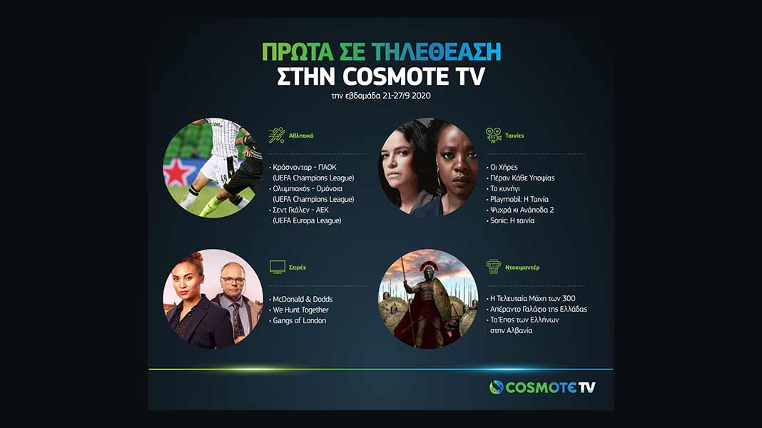 Οι αναμετρήσεις των ελληνικών ομάδων στις διασυλλογικές διοργανώσεις της UEFA και συγκεκριμένα τα ματς Κράσνονταρ-ΠΑΟΚ, Ολυμπιακός-Ομόνοια (UEFA Champions League) και Σεντ Γκάλεν-AEK (UEFA Europa League) κέρδισαν την προτίμηση των συνδρομητών της COSMOTE TV την εβδομάδα 21-27/9.