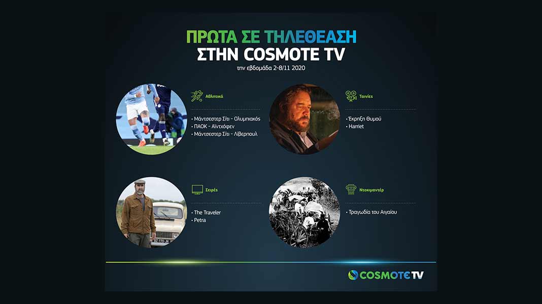 Από τα ντοκιμαντέρ που προβάλλονται στο COSMOTE HISTORY HD, «νικητής» της εβδομάδας 2-8/11 αναδείχθηκε η «Τραγωδία του Αιγαίου» του πολυβραβευμένου Έλληνα σκηνοθέτη Βασίλη Μάρου, ενώ το ενδιαφέρον των φίλων του ποδοσφαίρου στράφηκε στις μάχες των ελληνικών ομάδων στα UEFA Champions League και UEFA Europa League, καθώς και στις αναμετρήσεις της Premier League. Τα παιχνίδια που διαμόρφωσαν την πρώτη τριάδα είναι τα Μάντσεστερ Σίτι – Ολυμπιακός, ΠΑΟΚ – Αϊντχόφεν και Μάντσεστερ Σίτι – Λίβερπουλ.