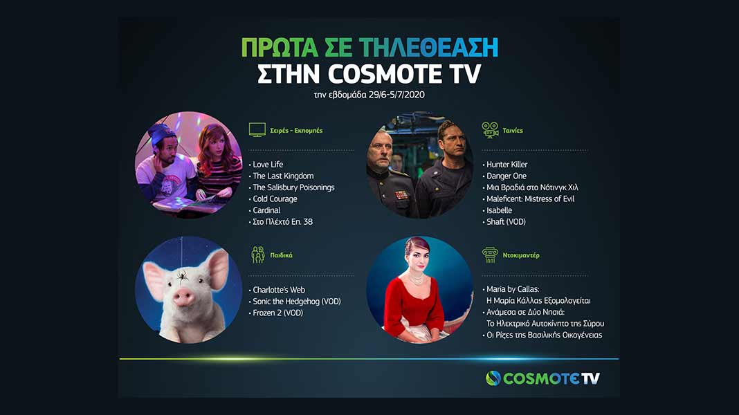 Όπως κάθε εβδομάδα, οι συνδρομητές περιηγήθηκαν στον δωρεάν, on demand κατάλογο της COSMOTE TV, στον οποίο βρίσκουμε πάνω από 800 ταινίες, 130 σειρές και 175 κύκλους επεισοδίων. Την προτίμηση του κοινού αυτή τη φορά συγκέντρωσαν οι σειρές «Cardinal» (4η σεζόν), «Cold Courage» (1η σεζόν), το νέο επεισόδιο της χιουμοριστικής εκπομπής σε παραγωγή COSMOTE TV «Στο Πλεχτό» και οι ταινίες «Charlotte‘s Web», «Maleficent: Mistress of Evil» και «Isabelle».