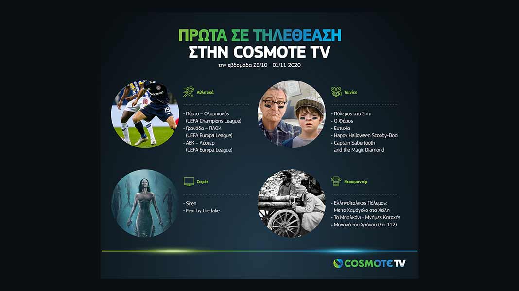 Στα κανάλια COSMOTE CINEMA HD, την «πρωτιά» κατέκτησε η βιογραφική ταινία του Άγγελου Φραντζή «Ευτυχία», σε συμπαραγωγή COSMOTE TV, ενώ μέσα από τον δωρεάν, on demand κατάλογο COSMOTE TV PLUS, το ενδιαφέρον του κοινού κέρδισε τουποψήφιο για OSCAR® θρίλερ του Ρόμπερτ Έγκερς, «Ο Φάρος» (The Lighthouse), με τους Γουίλεμ Νταφόε και Ρόμπερτ Πάτινσον, η νέα σειρά φαντασίας «Siren» και η γαλλική μίνι σειρά μυστηρίου «Fear by the lake», που έκαναν πρεμιέρα με όλα τα επεισόδια back-2-back στο COSMOΤΕ SERIES MARATHON HD.