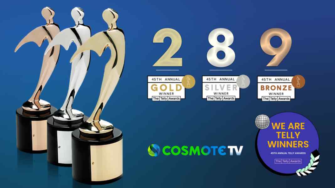 Δεκαεννιά βραβεία απέσπασε η COSMOTE TV στην 45η απονομή των Telly Awards, για την πρωτότυπη προώθηση του περιεχομένου της, τη χρήση καινοτόμων τεχνολογιών και τη δημιουργική εικαστική προσέγγιση σε εκπομπές και pop-up κανάλια. Στον μακροβιότερο διαγωνισμό τηλεόρασης και video παγκοσμίως, που πραγματοποιείται κάθε χρόνο στη Νέα Υόρκη, η COSMOTE TV διακρίθηκε ανάμεσα σε παγκοσμίου φήμης δίκτυα και τηλεοπτικές πλατφόρμες, όπως Netflix, Paramount Pictures, PlayStation Studios, National Geographic, NBC, MTV Entertainment Studios, λαμβάνοντας 2 Gold, 8 Silver και 9 Bronze βραβεία σε 9 διαφορετικές κατηγορίες.