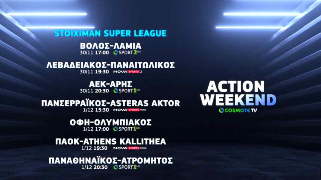 Οι συνδρομητές της COSMOTE TV, μέσω των καναλιών Novasports, θα έχουν τη δυνατότητα να παρακολουθήσουν τα ματς Λεβαδειακός-Παναιτωλικός (30/11, 19.30), Πανσερραϊκός-Αsteras AKTOR (1/12, 15.30) και ΠΑΟΚ-Athens Kallithea FC (1/12, 19.00) για την 13η αγωνιστική της Stoiximan Super League. Από τα μεγάλα ευρωπαϊκά πρωταθλήματα ξεχωρίζουν τα ματς Λίβερπουλ-Μάντσεστερ Σίτι (1/12, 18.00), Νιουκάστλ-Λίβερπουλ (4/12, 21.30), Άρσεναλ-Μάντσεστερ Γιουνάιτεντ (4/12, 22.15), Ντόρτμουντ-Μπάγερν (30/11, 19.30) και Μπιλμπάο-Ρεάλ Μαδρίτης (4/12, 22.00).