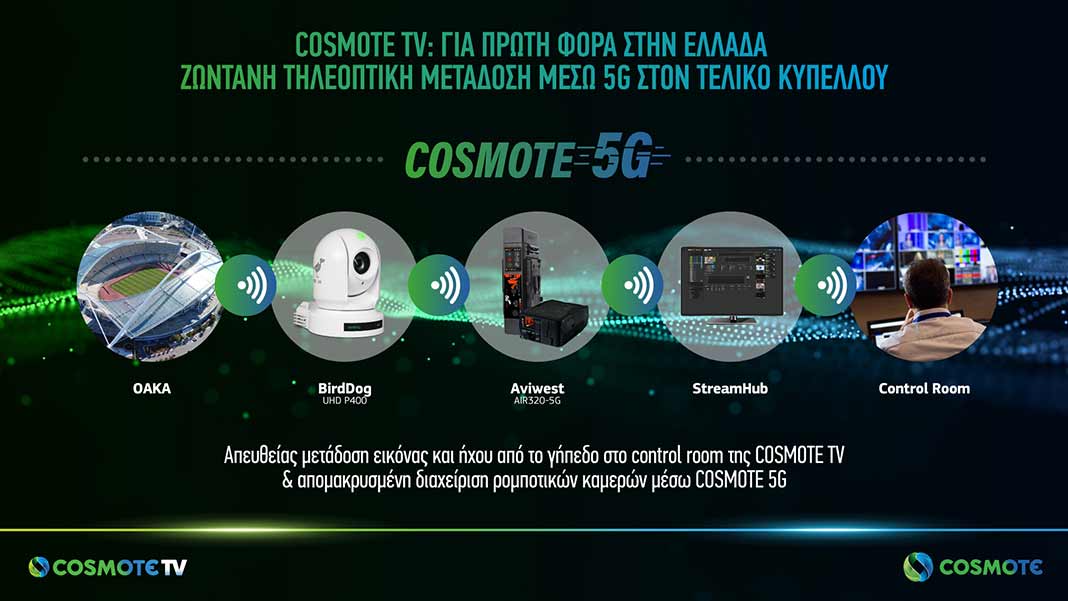 Η πρώτη ζωντανή τηλεοπτική μετάδοση μέσω δικτύου πέμπτης γενιάς στην Ελλάδα, πραγματοποιήθηκε κατά τη διάρκεια του τελικού Κυπέλλου Ελλάδος. Η COSMOTE TV προχώρησε σε μια πιλοτική εφαρμογή, που περιελάμβανε την απομακρυσμένη διαχείριση 2 ρομποτικών καμερών και την μετάδοση εικόνας και ήχου, μέσω COSMOTE 5G, χωρίς τη χρήση καλωδίων οπτικών ινών. Το use case αυτό, αλλάζει τα δεδομένα τόσο στην τηλεοπτική κάλυψη αθλητικών, πολιτιστικών και άλλων γεγονότων, όσο και στην εμπειρία θέασης, ανοίγοντας το δρόμο για μετάβαση από τα παραδοσιακά μέσα μετάδοσης, σε πιο σύγχρονες και αποτελεσματικές λύσεις, χάρη στα δίκτυα πέμπτης γενιάς.