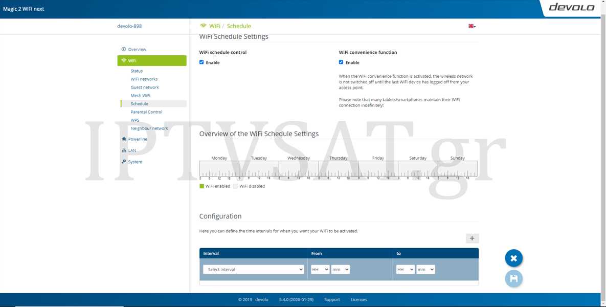 Στο μενού Schedule του Cockpit ή της εφαρμογής Home Network, μπορείτε να προγραμματίσετε πλήρως τα χρονικά διαστήματα λειτουργίας του WiFi, μέχρι και ανά εβδομάδα, με χρονική ακρίβεια λεπτού.