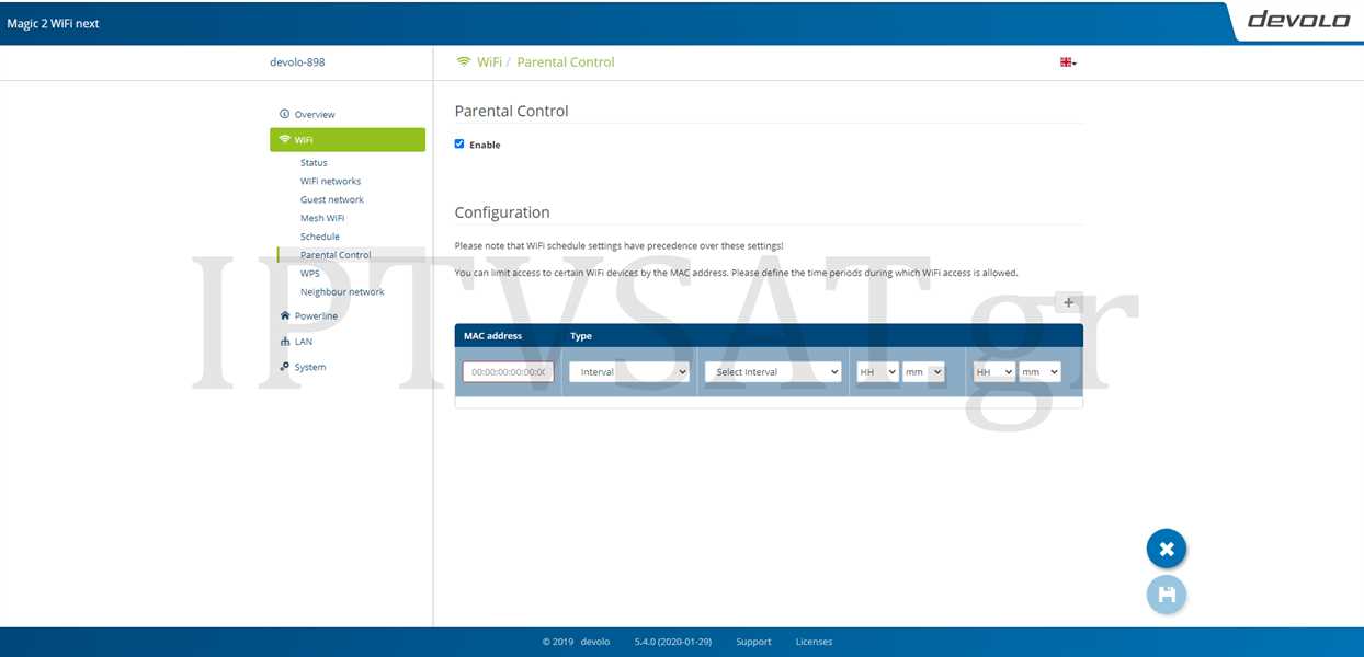 Με την εν λόγω δυνατότητα, μπορείτε να ελέγχετε πλήρως την πρόσβαση συγκεκριμένων συσκευών, βάσει της MAC address και να καθορίζετε τα χρονικά όρια προσβασιμότητας, όπως πχ μέγιστη διάρκεια πρόσβασης ανά ημέρα. Να σημειωθεί ότι οι ρυθμίσεις γονικού ελέγχου, υπόκεινται στις ρυθμίσεις Schedule οι οποίες έχουν προτεραιότητα.