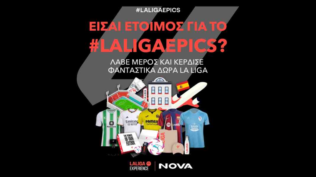 O διαγωνισμός LaLigaEpics δίνει τη δυνατότητα σε όλους όσοι είναι συνδρομητές υπηρεσίας τηλεόρασης Nova, να κερδίσουν μοναδικά αναμνηστικά δώρα της LaLiga ΕΑ Sports, μεταξύ άλλων και φανέλα της ομάδας που θα επιλέξουν οι νικητές. Τα δώρα όμως δεν σταματούν εδώ, καθώς όσοι συμμετέχουν και κερδίσουν σε έναν από τους 5 διαγωνισμούς, μπαίνουν αυτόματα στην κλήρωση για ένα ταξίδι στην Ισπανία για 2 άτομα για να παρακολουθήσουν από κοντά, τον Απρίλιο, αγώνα της LaLiga EA Sports μαζί με την αποστολή του Novasports σε μία πραγματικά μοναδική εμπειρία!