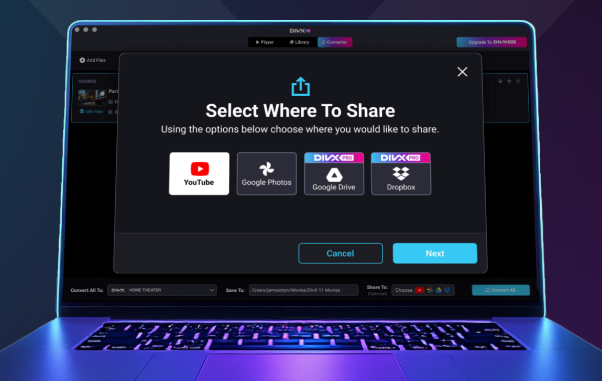 Με το DivX 11.13, οι χρήστες μπορούν να μετατρέπουν και να μοιράζονται τα βίντεό τους σε μια απρόσκοπτη ροή εργασιών. Η ενημέρωση επιτρέπει άμεσες μεταφορτώσεις σε δημοφιλείς πλατφόρμες, εξαλείφοντας την ανάγκη να χρησιμοποιούν πολλαπλά προγράμματα ή να κάνουν επιπλέον βήματα. Είτε πρόκειται για τη δημιουργία αντιγράφων ασφαλείας προσωπικών κλιπ, είτε για την κοινή χρήση αναμνήσεων με φίλους, είτε για τη δημοσίευση περιεχομένου στο διαδίκτυο, το DivX 11 Software τα συγκεντρώνει όλα για μέγιστη ευκολία.