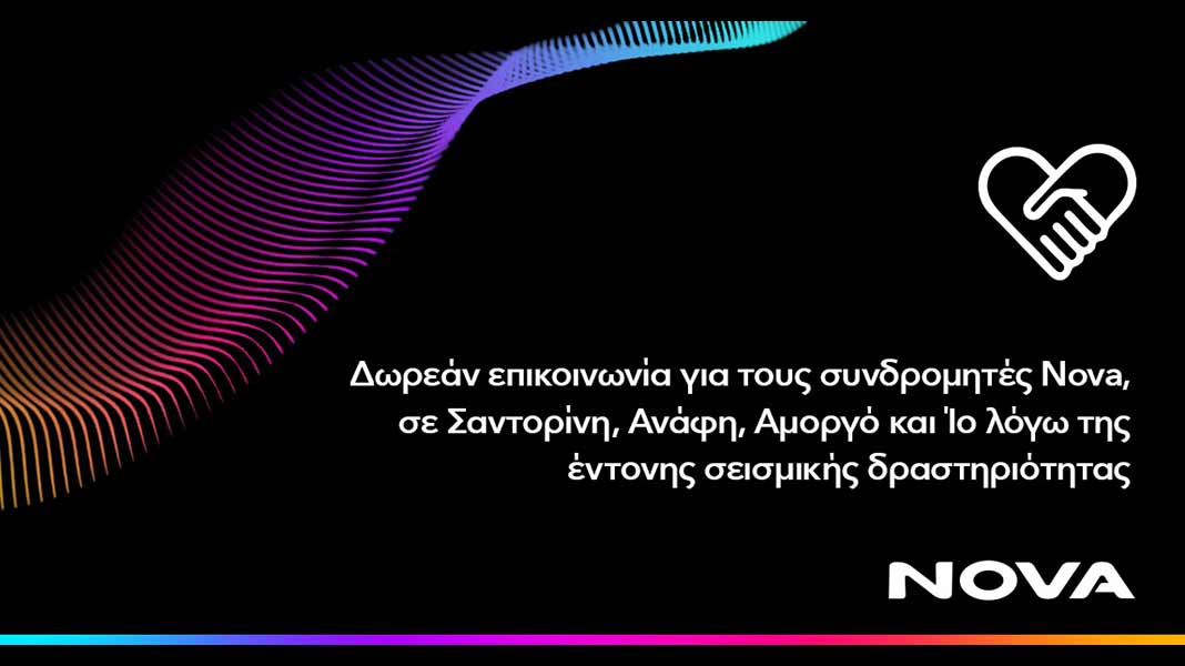 Η Nova, μέλος της United Group, του κορυφαίου παρόχου τηλεπικοινωνιών και Media στη Νοτιοανατολική Ευρώπη, κατανοώντας τις αυξημένες ανάγκες επικοινωνίας λόγω έντονης σεισμικής δραστηριότητας στα νησιά της Σαντορίνης, της Ανάφης, της Αμοργού και της Ίου, ενημερώνει τους συνδρομητές της ότι βρίσκεται κοντά τους με δωρεάν υπηρεσίες επικοινωνίας.