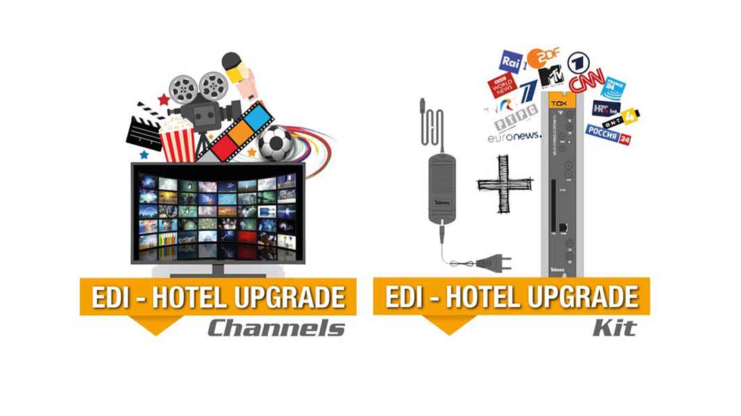 Το EDI-HOTEL UPGRADE KIT, είναι ένα σετ προϊόντων Televes αποτελούμενο από ένα EDI-HOTEL module 564301 Τ.0Χ και το τροφοδοτικό του, σε συνδυασμό με έτοιμα, προγραμματισμένα δορυφορικά κανάλια της επιλογής σας μέσα στο module, από τα έτοιμα “πακέτα” δορυφορικών καναλιών των EDI-HOTEL.