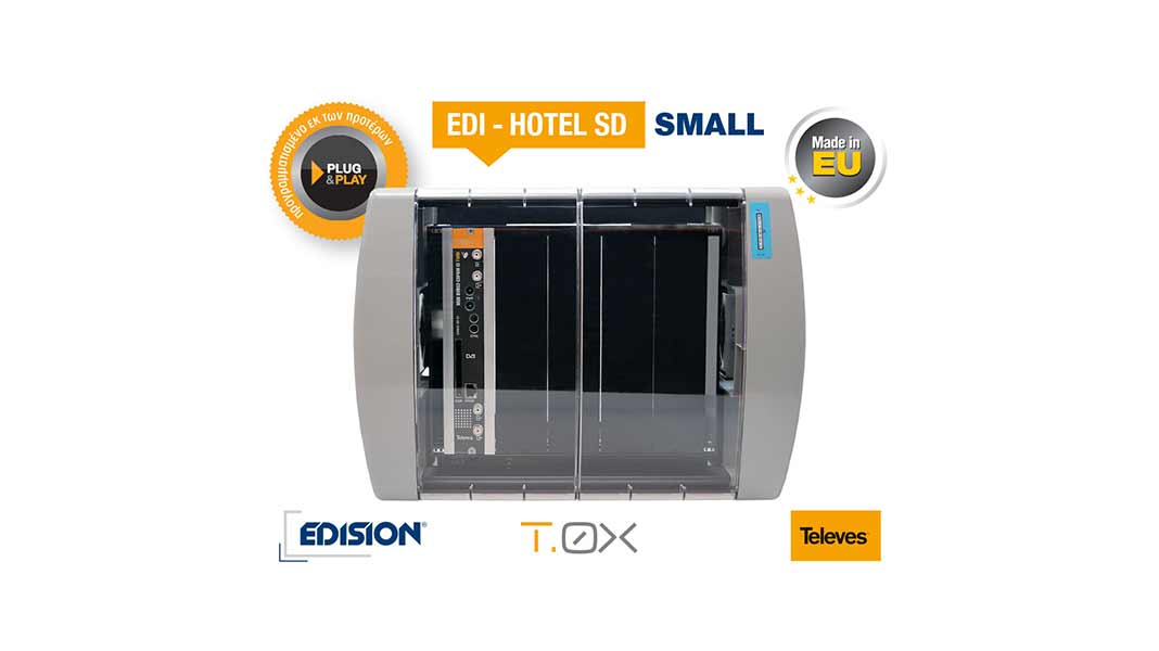 Το επαγγελματικό τηλεοπτικό πακέτο EDI – HOTEL SD Small το οποίο δοκιμάσαμε, είναι modular headend μονάδα της επαγγελματικής σειράς Τ.0Χ της TELEVES, μέσα σε κυτίο της ίδιας σειράς, με ενεργό εξαερισμό και κλείδωμα, η οποία περιέχει έτοιμα, προγραμματισμένα πακέτα των πιο δημοφιλών δορυφορικών τηλεοπτικών καναλιών, τα οποία θα ικανοποιήσουν κάθε αίτημα τηλεοπτικής ψυχαγωγίας και ενημέρωσης των φιλοξενούμενων του ξενοδοχείου. Απαρτίζεται από κωδικούς προϊόντων εξ ολοκλήρου κατασκευασμένους από τον διεθνούς φήμης Όμιλο TELEVES, ο οποίος εξειδικεύεται σε high-end εφαρμογές λήψης-επεξεργασίας και διανομής τηλεοπτικών σημάτων, για την υλοποίηση ιδιαίτερα απαιτητικών projects σε πολυτελείς ξενοδοχειακές μονάδες και φημισμένα resorts παγκοσμίως.