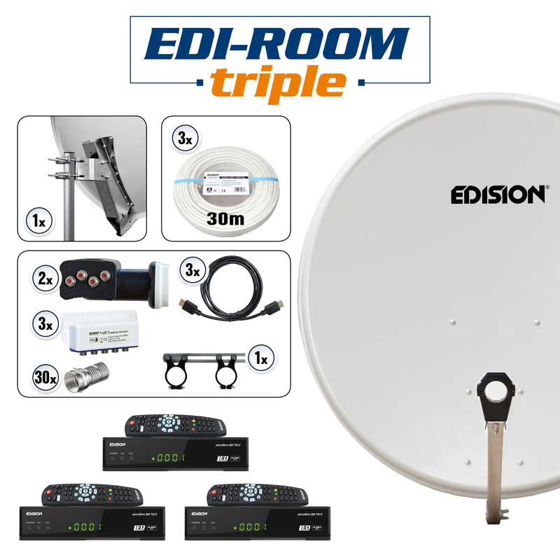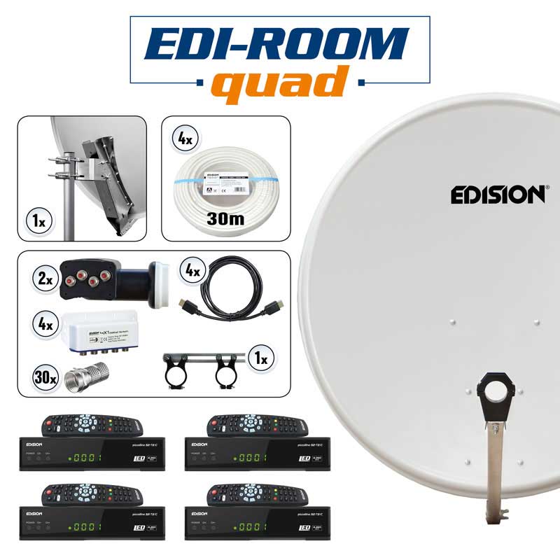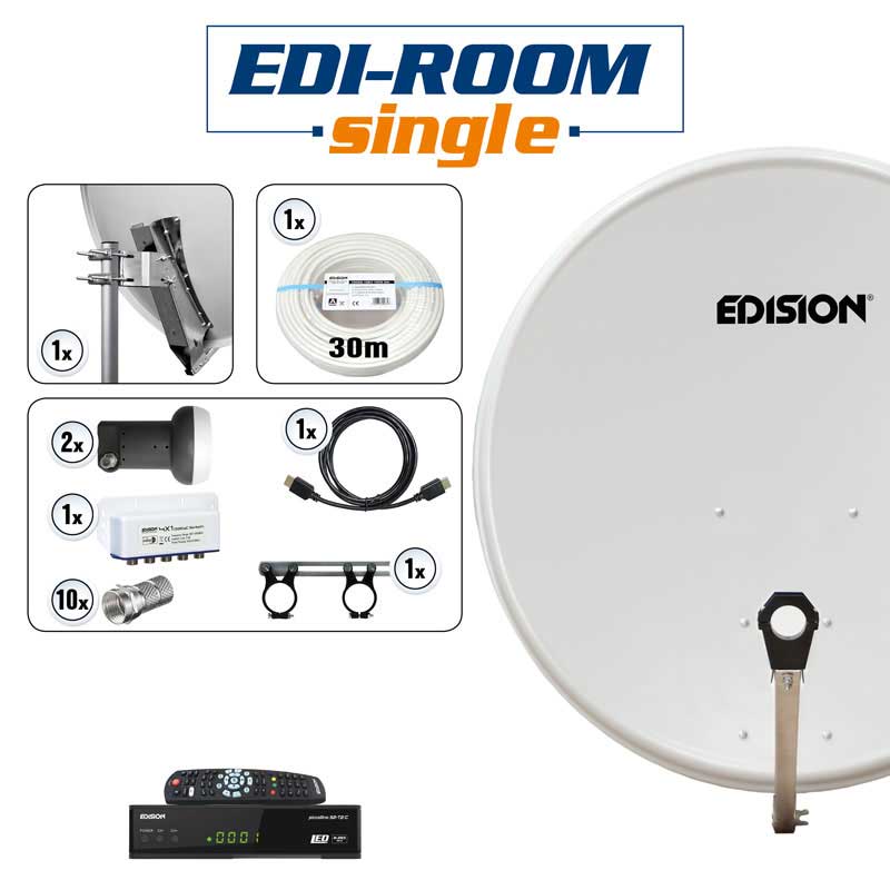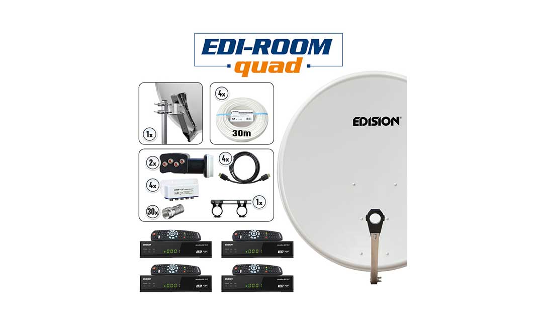 Πρόσφατα, η EDISION παρουσίασε 4 έτοιμα πακέτα εξοπλισμού λήψης, με τις κωδικές ονομασίες EDI-ROOM single/twin/triple/quad με αντίστοιχο αριθμό δεκτών. Τα εν λόγω τηλεοπτικά πακέτα EDI-ROOM λαμβάνουν ~350 Ελεύθερα Δορυφορικά Τηλεοπτικά κανάλια* και ~150 Ελεύθερα Δορυφορικά Ραδιοφωνικά κανάλια*, ήδη επιλεγμένα και προ-συντονισμένα μέσα στους combo δέκτες PICCOLLINO S2+T2/C, οι οποίοι συνοδεύονται από τηλεχειριστήριο 2-σε-1 για δέκτη και 5 βασικές λειτουργίες της TV. Πρόκειται για κανάλια από τους δημοφιλείς δορυφόρους Astra 19,2Ε και Hotbird 13Ε, χωρισμένα στα Favorites ανά χώρα. Τα πακέτα διατίθεται ως ολοκληρωμένη λύση, με υλικά εγκατάστασης και σύνδεσης για τον τεχνικό και τον χρήστη αλλά και με προγραμματισμένους τους combo δέκτες, αποτελώντας την ιδανική επιλογή για μονάδες ενοικιαζόμενων δωματίων, ηλεκτρονικές πλατφόρμες βραχυχρόνιας μίσθωσης κατοικιών, καταστήματα και μόνιμες ή εξοχικές κατοικίες!