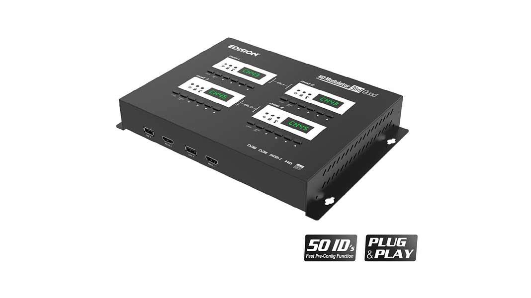 Το νέο HDMI MODULATOR 3in1 QUAD, είναι ένα 4-κάναλο MPEG4 modulator, το οποίο δέχεται 4 εισόδους σήματος από συσκευές πηγής με έξοδο HDMI και παράγει στην RF MPEG4 έξοδό του 2 κανάλια VHF/UHF MPEG4, με σήμα DVB-T, ISDB-T αλλά πλέον και καλωδιακό DVB-C, εξοικονομώντας κανάλια στην επιλεγμένη μπάντα εξόδου!