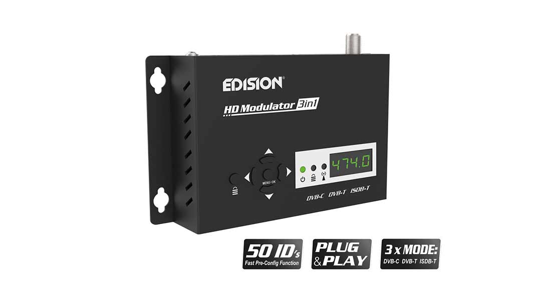 Ένα πρωτότυπο modulator παρουσίασε πρόσφατα η EDISION και αναφερόμαστε στο HDMI MODULATOR 3in1 με 3 κατ’ επιλογή σήματα διαμόρφωσης DVB-C, DVB-T & ISDB-T.