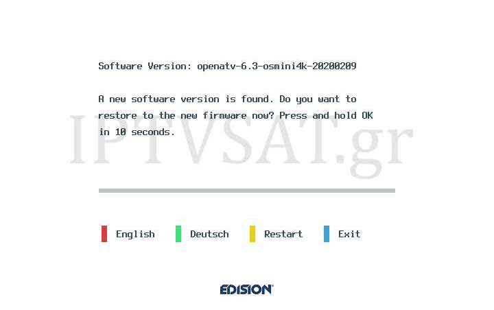 O OS mini 4K διατίθεται με εγκατεστημένο το εξαιρετικό OpenATV στην τελευταία έκδοση 6.3, το οποίο μπορείτε εύκολα να το αναβαθμίσετε online, προκειμένου να έχετε τις απόλυτα πρόσφατες δυνατότητες. Σαφώς, μπορείτε να φορτώσετε και οποιοδήποτε άλλο διαθέσιμο λογισμικό κυκλοφορεί για τον συγκεκριμένο δέκτη, ωστόσο δεν θα χρειαστεί, καθώς το OpenATV, είναι εξαιρετικά ισχυρό και αξιόπιστο σε όλες τις λειτουργίες του. Σε περίπτωση που επιθυμείτε κάποια αλλαγή λογισμικού, μπορείτε να το κάνετε συνδέοντας ένα στικάκι με αποθηκευμένο τον φάκελο osmini4k του νέου λογισμικού σε κάποια υποδοχή USB και ενεργοποιώντας απλώς τον δέκτη (δεν χρειάζεται να πατάτε κάποιο πλήκτρο). Πολύ σύντομα, θα δείτε στην οθόνη σας ένα μήνυμα που θα σας προτρέπει να πατήσετε το ΟΚ στο τηλεχειριστήριο μέσα σε 10 δευτερόλεπτα, προκειμένου ο δέκτης να συνεχίσει με αναβάθμιση και όχι με κανονική εκκίνηση. Σε λίγα δευτερόλεπτα, ο δέκτης αναβαθμίζεται με το νέο λογισμικό. Στο εν λόγω μήνυμα, παρέχεται η δυνατότητα αγγλικής και γερμανικής γλώσσας, καθώς και επανεκκίνησης ή εξόδου, με χρήση των χρωματικών πλήκτρων. Οι βασικές επιλογές του κύριου μενού στο OpenATV 6.3 είναι: Πάνελ Πληροφοριών, Πληροφορίες, Χρονοδιακόπτες, Πρόσθετα, Εγκατάσταση, Αναμονή/Επανεκκίνηση.