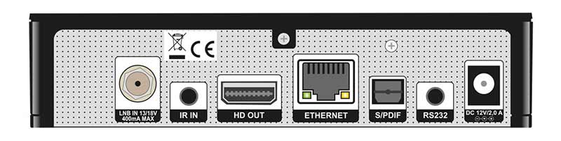 Στη πίσω όψη, έχουμε μία είσοδο LNB, έξοδο HDMI 1.4a, οπτική έξοδο ψηφιακού ήχου S/PDIF, θύρα Ethernet 10/100, RS232 σε mini jack, υποδοχή εξωτερικού αισθητήρα IR και την είσοδο για το παρεχόμενο εξωτερικό τροφοδοτικό.