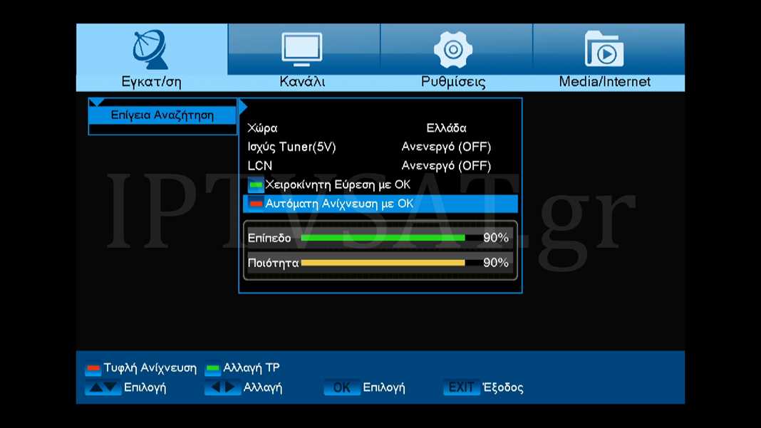 Η επιλογή Εγκατάσταση αφορά την αυτόματη και χειροκίνητη αναζήτηση καναλιών, με επιλογή χώρας, τροφοδοσίας 5V μέσω tuner και ενεργοποίηση LCN.