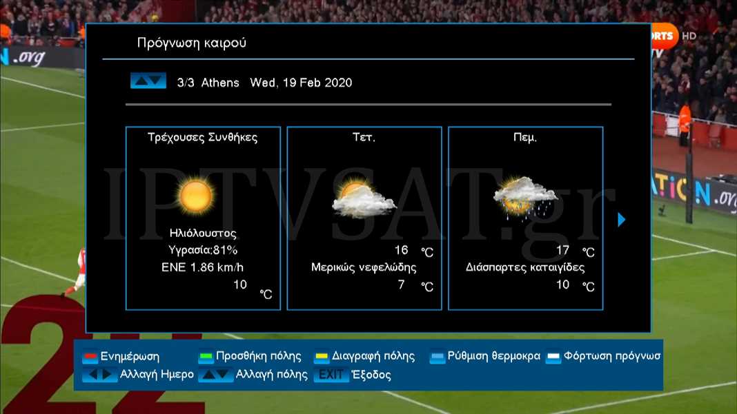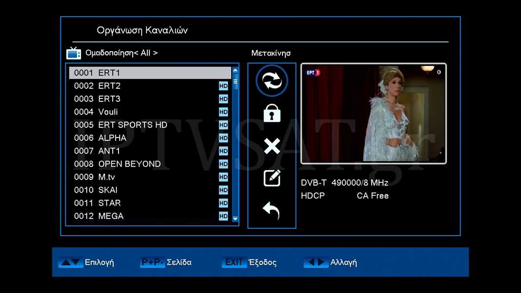 Στη διαδρομή Κανάλι -> Οργάνωση Καναλιών, μπορούμε να κάνουμε ομαδοποίηση κατά όλα, Αγαπημένα, Επίγεια, και HD με το κόκκινο πλήκτρο, καθώς και να πραγματοποιούμε μετακίνηση, κλείδωμα, διαγραφή, μετονομασία και παράλειψη.