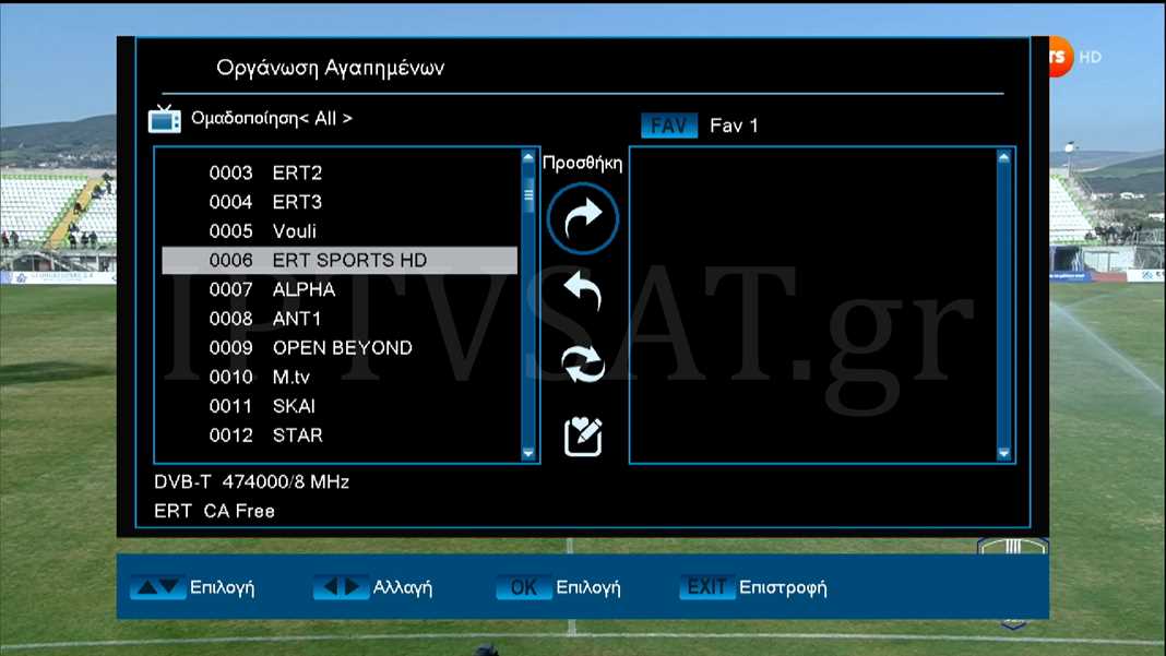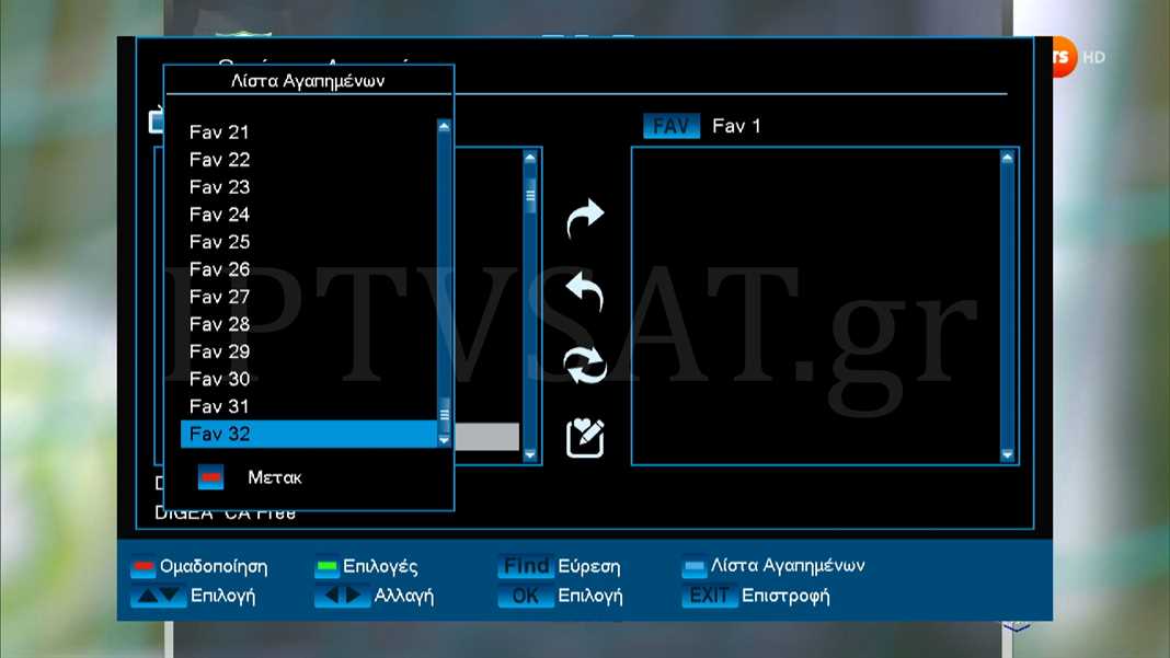 Στο εν λόγω μενού, με το μπλε πλήκτρο επιλέγουμε κάποια από τις 32 λίστες, πατάμε ΟΚ σε όποια κανάλια επιθυμούμε από την βασική λίστα αριστερά και με το πλήκτρο δεξιά (μία θέση), επιλέγουμε προσθήκη. Τα κανάλια που έχουμε «μαρκάρει» μπήκαν πλέον στην αγαπημένη λίστα. Επιλέγοντας μετονομασία αντί προσθήκη, δίνουμε όνομα της αρεσκείας μας και στις 32 λίστες.
