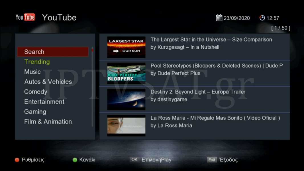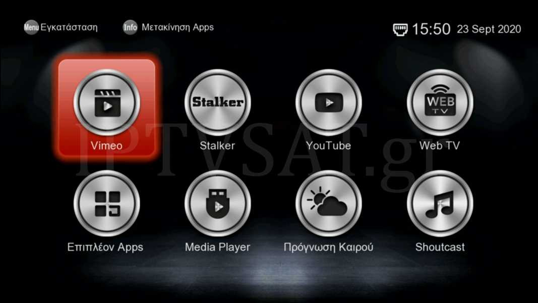 Στα μενού του δέκτη, θα βρείτε τις εφαρμογές: YouTube, Stalker TV, WebTV, Dailymotion, Shoutcast, Καιρός, Media Player, Xtream, Vimeo.