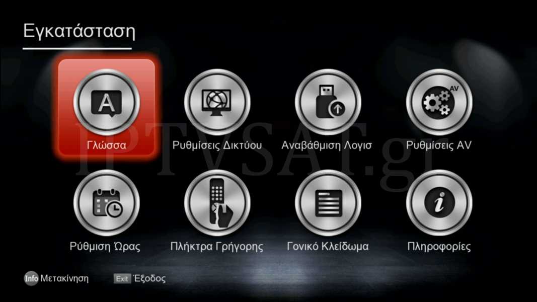 Με το πλήκτρο Menu στην αρχική οθόνη, αποκτάμε πρόσβαση στο μενού Εγκατάσταση, το οποίο περιλαμβάνει όλες τις ρυθμίσεις λειτουργίας και συγκεκριμένα: Γλώσσα, Ρυθμίσεις Δικτύου, Αναβάθμιση λογισμικού, Ρυθμίσεις AV, Ρύθμιση Ώρας, Πλήκτρα Γρήγορης πλοήγησης, Γονικό Κλείδωμα και Πληροφορίες, ενώ και σε αυτή τη περίπτωση, μπορούμε – με το πλήκτρο INFO – να αλλάξουμε τη θέση των εικονιδίων.
