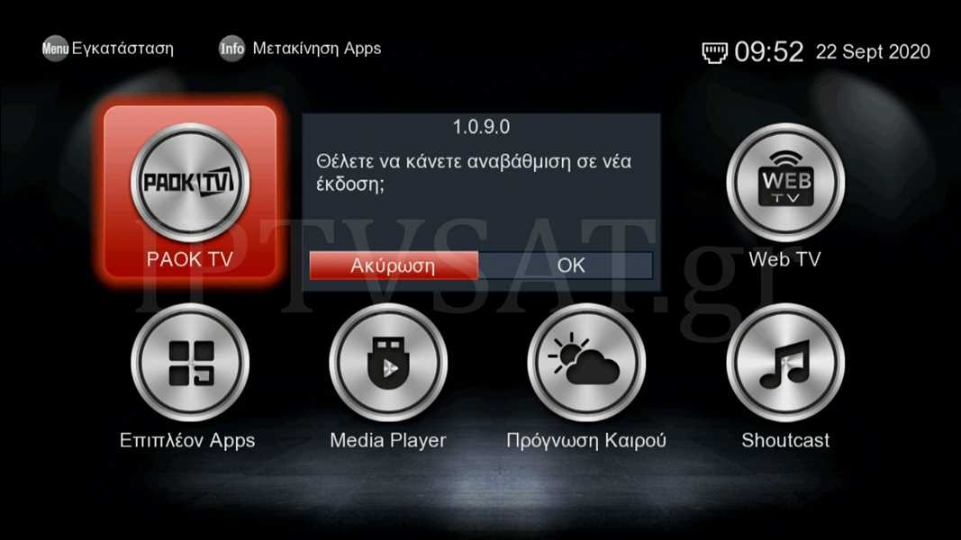 Στην αρχική οθόνη που εμφανίζεται, φαίνονται οι εφαρμογές Vimeo, Stalker, YouTube, Web TV, Media Player, Πρόγνωση Καιρού και Shoutcast, ενώ με την επιλογή “Επιπλέον Apps”, βρίσκουμε και τις εφαρμογές Dailymotion, Xtream και YouPorn.