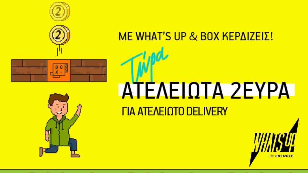 Mε χιλιάδεςκαταστήματα σε όλη την Ελλάδα,όπως μεγάλες αλυσίδες εστίασης, δημοφιλή brands και τοπικές επιχειρήσεις,οι χρήστες του WHAT’S UP θα βρουν στο BOX, την υπηρεσία online παραγγελίας φαγητού της COSMOTE, μια μεγάλη ποικιλία σε γεύσεις και κουζίνες για να παραγγείλουν αυτό που επιθυμούν. Η πλατφόρμα του ΒΟΧ εμπλουτίζεται συνεχώς με νέες περιοχές και νέες κατηγορίες προϊόντων. Παράλληλα, οι χρήστες του WHAT’S UP σε κάθε παραγγελία στο ΒΟΧ επωφελούνται διπλά: μπορούν να χρησιμοποιήσουν και την έκπτωση των 2€ και να κερδίζουν πόντους και GB στις παραγγελίες τους.