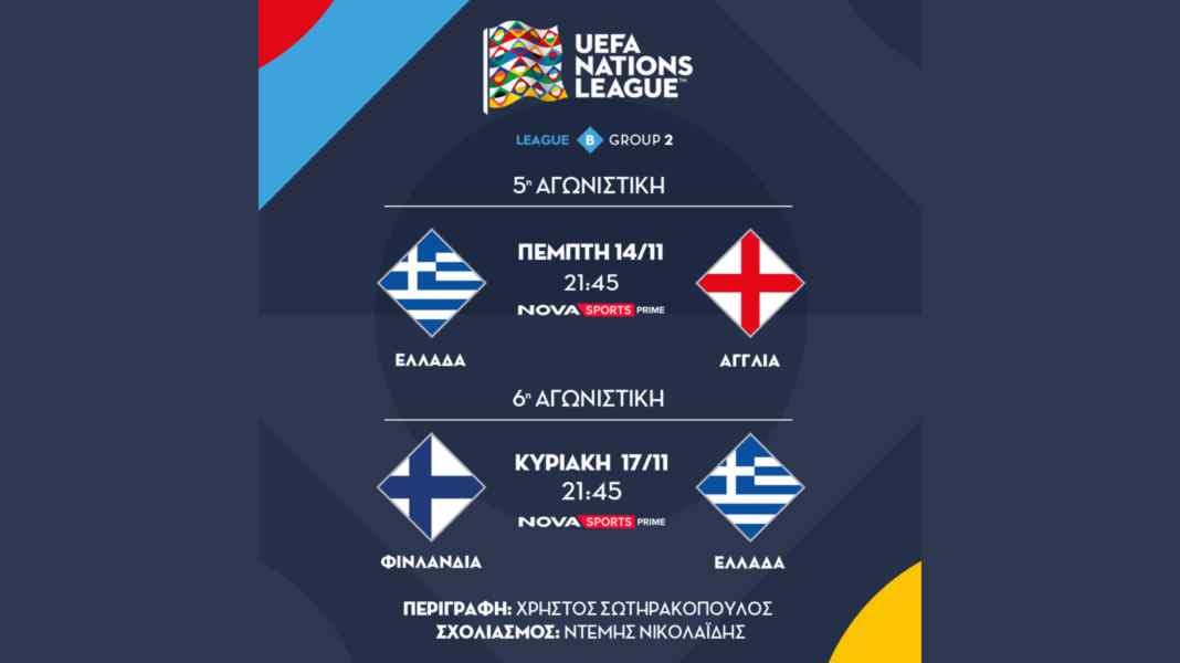 Στο UEFA Nations League η Εθνική μας ομάδα με τον Ιβάν Γιοβάνοβιτς πάγκο μετά το 4Χ4 στις τέσσερις πρώτες αγωνιστικές υποδέχεται στο ΟΑΚΑ την Αγγλία (14/11, 21:45) και αντιμετωπίζει εκτός έδρας την Φινλανδία (17/11, 19:00) με στόχο να συνεχίσει τα θετικά αποτελέσματα, κατακτώντας την πρώτη θέση και την άνοδο στη League A που οδηγεί στους τελικούς και στην ελπίδα για εισιτήριο στο Μουντιάλ του 2026. Οι αγώνες της «γαλανόλευκης» θα μεταδοθούν στο Novasports Prime σε περιγραφή του Χρήστου Σωτηρακόπουλου και σχόλιο του Ντέμη Νικολαΐδη.