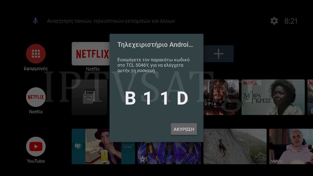 Στη προσπάθεια για σύνδεση με την συσκευή σας, θα εμφανιστεί στην οθόνη ένας κωδικός, τον οποίο θα πρέπει να εισαγάγετε στην εφαρμογή Android TV Remote προκειμένου να ολοκληρωθεί η σύνδεση.