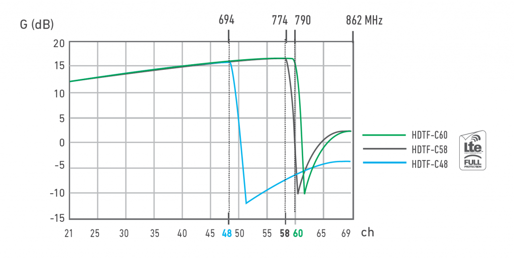 • Σχεδιασμένη για να αποφεύγει τον κορεσμό του ενεργού εξοπλισμού από σήματα LTE, απόρριψη υψηλότερων συχνοτήτων 694 ή 790 MHz ανάλογα με το μοντέλο.