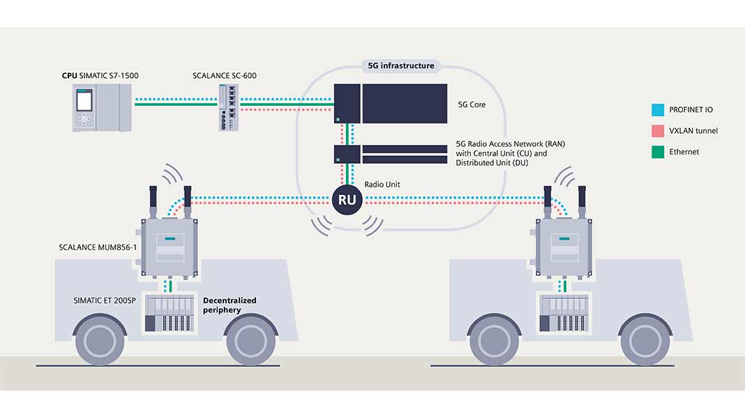 Η Siemens επιτρέπει τη μετάδοση του Profinet IO μέσω ενός ιδιωτικού δικτύου 5G, το οποίο επιτρέπει τη μετάδοση δεδομένων σε πραγματικό χρόνο για βιομηχανικές εφαρμογές.  Αυτό καθίσταται εφικτό χάρη στην τεχνολογία μετάδοσης VXLAN (Virtual Extensible LAN) που υποστηρίζουν τα router Scalance 5G και οι συσκευές ασφαλείας της Siemens. Η VXLAN ενσωματώνει το πρωτόκολλο Profinet IO, το οποίο μεταδίδεται στο Layer 2, σε πακέτα Layer 3, επιτρέποντας τη μετάδοση πέρα από τα όρια του δικτύου. Δεδομένου ότι η επικοινωνία Layer 2 πραγματοποιείται πλέον μέσω 5G, ένας κεντρικός ελεγκτής μπορεί να επικοινωνεί με αποκεντρωμένες μονάδες I/O σε κινούμενες συσκευές, όπως αυτοματοποιημένα καθοδηγούμενα οχήματα (AGV) μέσω Profinet σε ιδιωτικό δίκτυο 5G χωρίς την ανάγκη για τοπικό έλεγχο σε κάθε AGV. Αυτό εξοικονομεί κόστος ενέργειας και συντήρησης. Οι επισκέπτες της Hannover Messe είχαν την ευκαιρία να δουν από κοντά αυτή την καινοτομία.