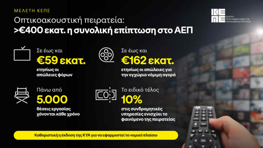 Σε πάνω από €400 εκατ. εκτιμάται η συνολική ετήσια επίπτωση στο ΑΕΠ της χώρας από την οπτικοακουστική πειρατεία, σύμφωνα με μελέτη[1] του Κέντρου Προγραμματισμού και Οικονομικών Ερευνών (ΚΕΠΕ) για λογαριασμό της Εταιρίας Προστασίας Οπτικοακουστικών Έργων (ΕΠΟΕ).