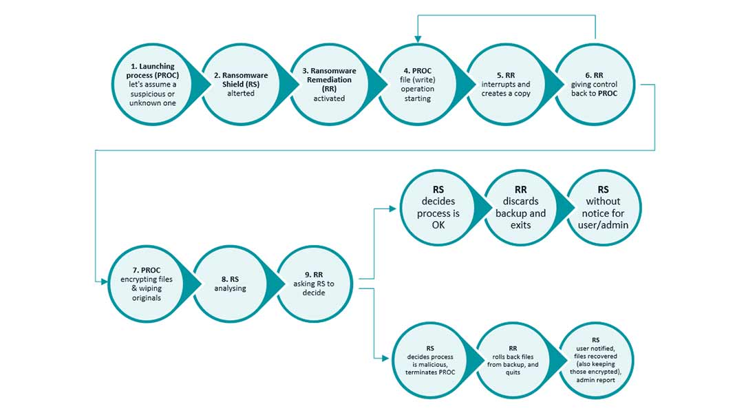 Η λειτουργία ESET RR λειτουργεί σε συνεργασία με τη λειτουργία RS, το οποίο ανιχνεύει ύποπτη δραστηριότητα και ενεργοποιεί τη λειτουργία RR για να δημιουργήσει αντίγραφα ασφαλείας των δεδομένων. Αν η διαδικασία αποδειχθεί ασφαλής, το αντίγραφο ασφαλείας διαγράφεται. Αντίθετα, αν η RS εντοπίσει κακόβουλη δραστηριότητα, η απειλή τερματίζεται και τα αρχεία αποκαθίστανται από το αντίγραφο ασφαλείας.