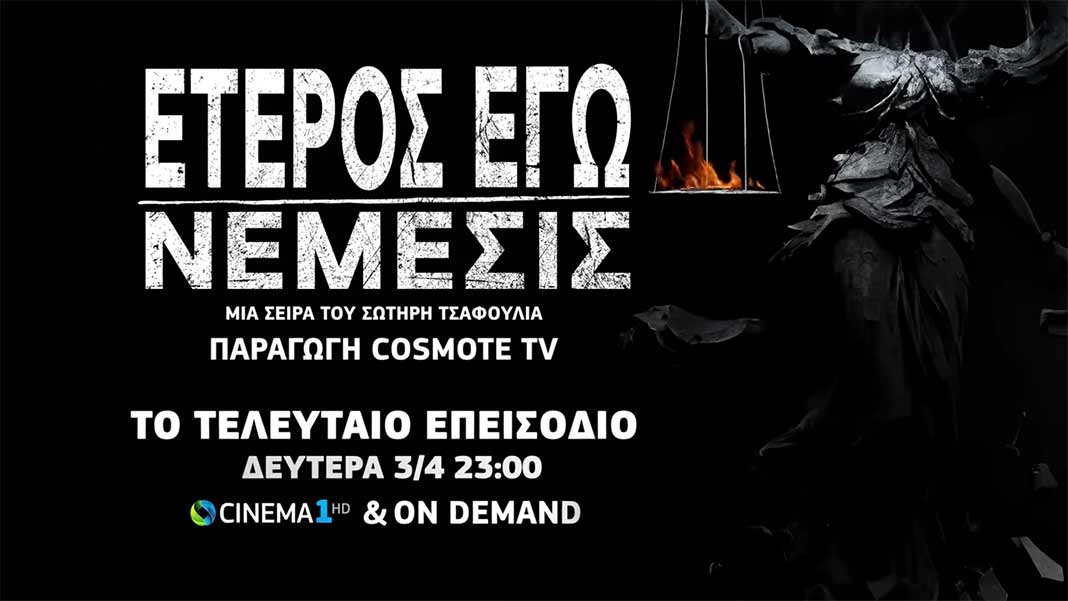 Ο επίλογος του «Έτερος Εγώ: Νέμεσις» θα προβληθεί στο COSMOTE CINEMA 1HD και ταυτόχρονα σε 4Κ ποιότητα στον δωρεάν on demand κατάλογο σειρών και ταινιών. Μετά την προβολή και του τελευταίου επεισοδίου, η σειρά θα παραμείνει διαθέσιμη on demand.