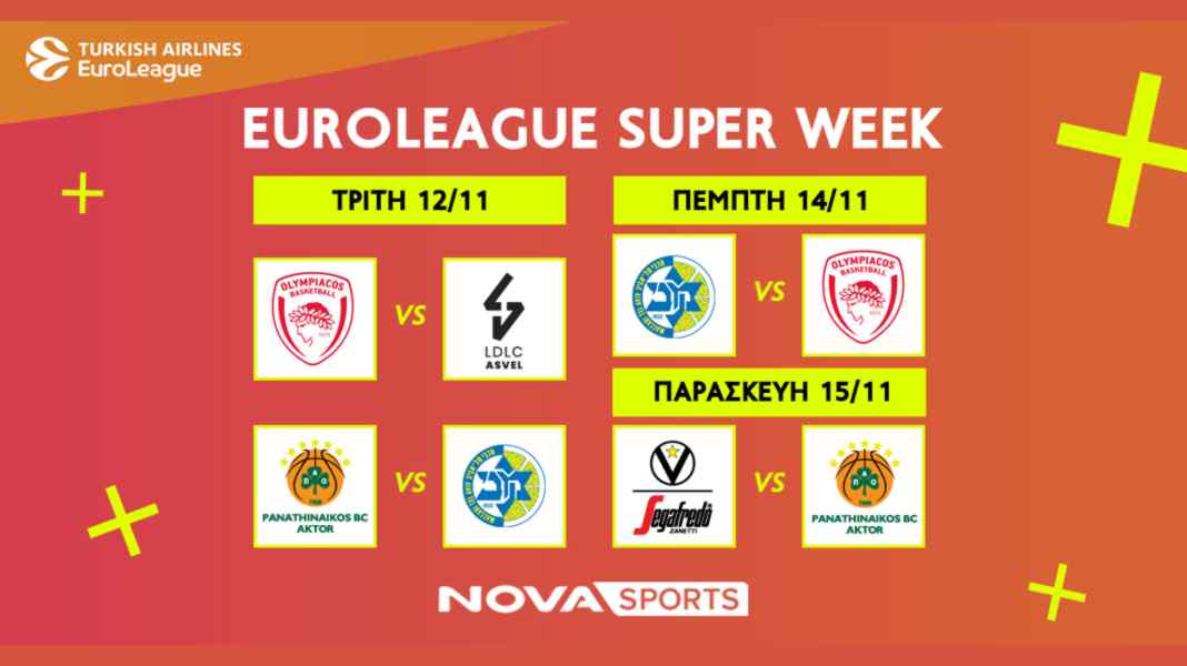 H «Διαβολοβδομάδα» Νο3 της EuroLeague, της κορυφαίας ευρωπαϊκής διασυλλογικής διοργάνωσης στο χώρο του μπάσκετ, έρχεται αυτή την εβδομάδα στο παρκέ του Novasports! Τα φώτα πέφτουν στις αναμετρήσεις των ελληνικών ομάδων Ολυμπιακός-Βιλερμπάν (12/11, 21:00) & Παναθηναϊκός AKTOR – Μακάμπι Τελ Αβίβ (12/11, 21:15) για την 9η αγωνιστική και Μακάμπι Τελ Αβίβ-Ολυμπιακός (14/11, 20:00) & Βίρτους Μπολόνια-Παναθηναϊκός AKTOR (15/11, 21:30) για την 10η αγωνιστική.