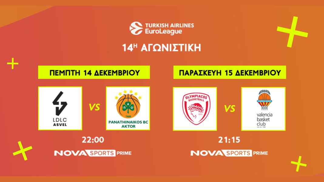 Το μπασκετικό θέαμα στο παρκέ του Novasports με EuroLeague και τους «αιωνίους», με EuroCup και τον Άρη καθώς και με το NCAA συνεχίζεται με αμείωτη ένταση και αυτή την εβδομάδα! Στην EuroLeague, την κορυφαία ευρωπαϊκή διασυλλογική διοργάνωση στο χώρο του μπάσκετ, δεσπόζουν οι αγώνες Βιλερμπάν – Παναθηναϊκός AKTOR (14/12, 22:00) και Ολυμπιακός – Βαλένθια (15/12, 21:15) στο πλαίσιο της 14ης αγωνιστικής. Παράλληλα, οι φίλοι του μπάσκετ θα απολαύσουν LIVE και όλους τους υπόλοιπους αγώνες της EuroLeague με το ενδιαφέρον να στρέφεται στις αναμετρήσεις Ρεάλ Μαδρίτης-Μπάγερν Μονάχου, Μπαρτσελόνα-Αρμάνι Μιλάνο, Μακάμπι Τελ Αβίβ-Αναντολού Εφές και Φενερμπαχτσε – Μονακό.