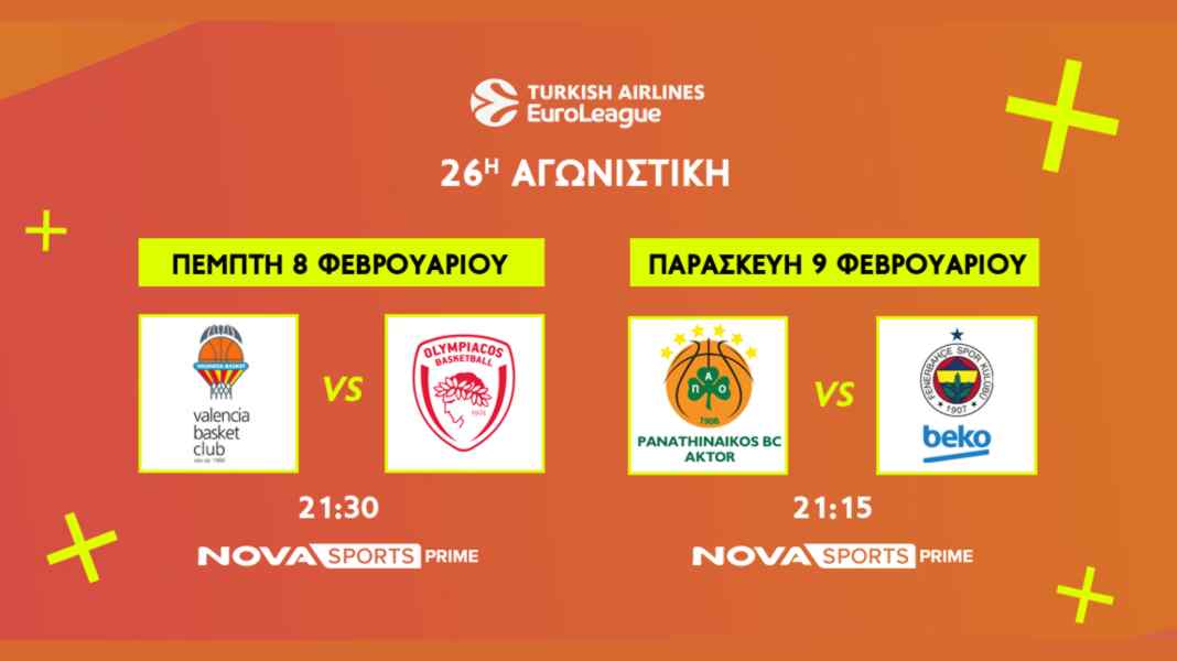 Με αμείωτη ένταση και συναρπαστικές αναμετρήσεις συνεχίζεται το μπασκετικό υπερθέαμα στο παρκέ του Novasports με EuroLeague και τους «αιωνίους», με EuroCup και τον Άρη καθώς και με NCAA αλλά και FIBA Women’s Olympic Qualifying Tournament! Στην EuroLeague, την κορυφαία ευρωπαϊκή διασυλλογική διοργάνωση στο χώρο του μπάσκετ, δεσπόζουν οι αγώνες Βαλένθια – Ολυμπιακός (8/2, 21:30) & Παναθηναϊκός AKTOR – Φενέρμπαχτσε (9/2, 21:15) στο πλαίσιο της 26ης αγωνιστικής. Παράλληλα, οι φίλοι του μπάσκετ θα απολαύσουν LIVE και όλους τους υπόλοιπους αγώνες της EuroLeague με το ενδιαφέρον να στρέφεται στους αγώνες Αρμάνι Μιλάνο-Ρεάλ Μαδρίτης Αναντολού Εφές-Μακάμπι Τελ Αβίβ, Παρτίζαν-Μπάγερν Μονάχου, Βίρτους Μπολόνια-Μονακό.