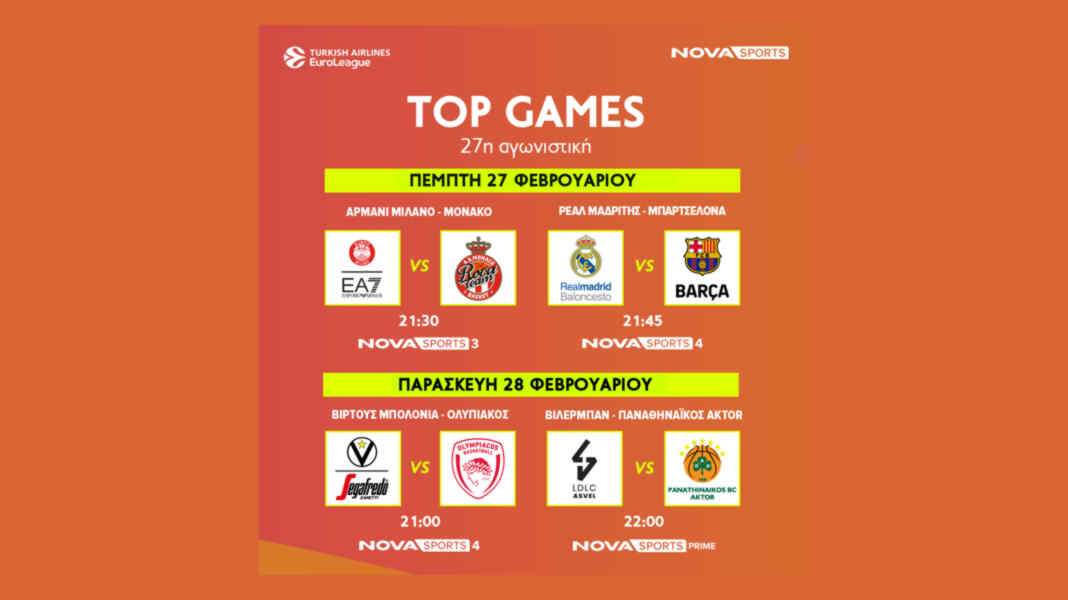 Η EuroLeague η κορυφαία ευρωπαϊκή διασυλλογική διοργάνωση στο χώρο του μπάσκετ, επιστρέφει στην αγωνιστική δράση μετά από διακοπή δύο εβδομάδων και οι συνδρομητές της Nova ετοιμάζονται να απολαύσουν τις αναμετρήσεις της 27ς αγωνιστικής Βίρτους Μπολόνια – Ολυμπιακός (28/2, 21:00), Βιλερμπάν – Παναθηναϊκός AKTOR (28/2, 22:00).