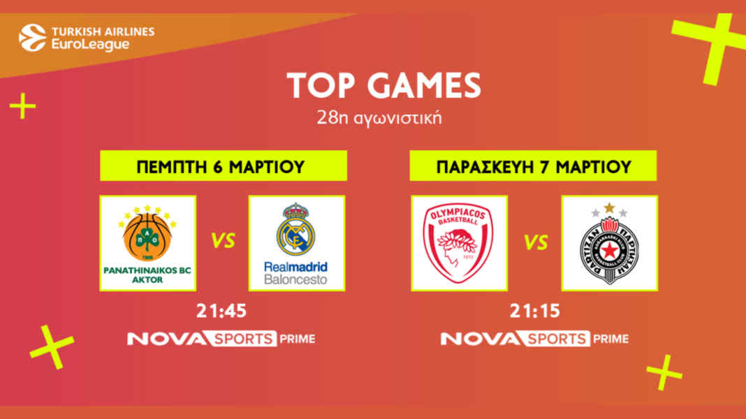 Η EuroLeague η κορυφαία ευρωπαϊκή διασυλλογική διοργάνωση στο χώρο του μπάσκετ, συνεχίζεται με αμείωτο ενδιαφέρον και οι συνδρομητές της Nova ετοιμάζονται να απολαύσουν τις αναμετρήσεις της 28ης αγωνιστικής Παναθηναϊκός AKTOR – Ρεάλ Μαδρίτης (6/3, 21:45) και Ολυμπιακός – Παρτίζαν (7/3, 21:15) στο παρκέ του Novasports.