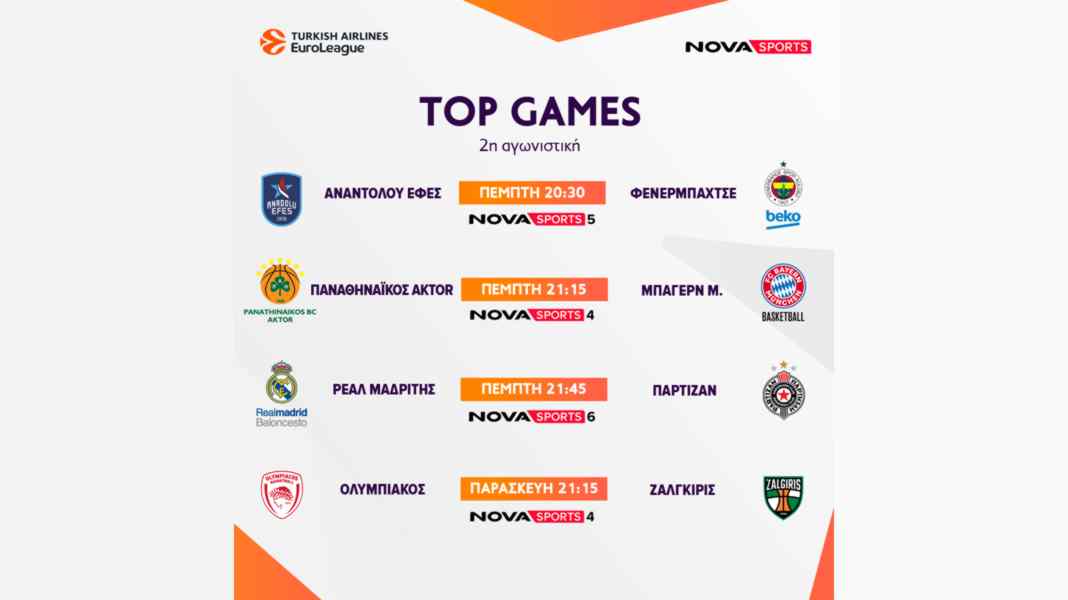 Η EuroLeague, η κορυφαία ευρωπαϊκή διασυλλογική διοργάνωση στο χώρο του μπάσκετ ξεκίνησε εντυπωσιακά, η συνέχεια αναμένεται ακόμη πιο συναρπαστική και οι συνδρομητές της Nova ετοιμάζονται για τους αγώνες της 2ης αγωνιστικής Παναθηναϊκός AKTOR – Μπάγερν και Ολυμπιακός – Ζαλγκίρις στο παρκέ του Novasports!