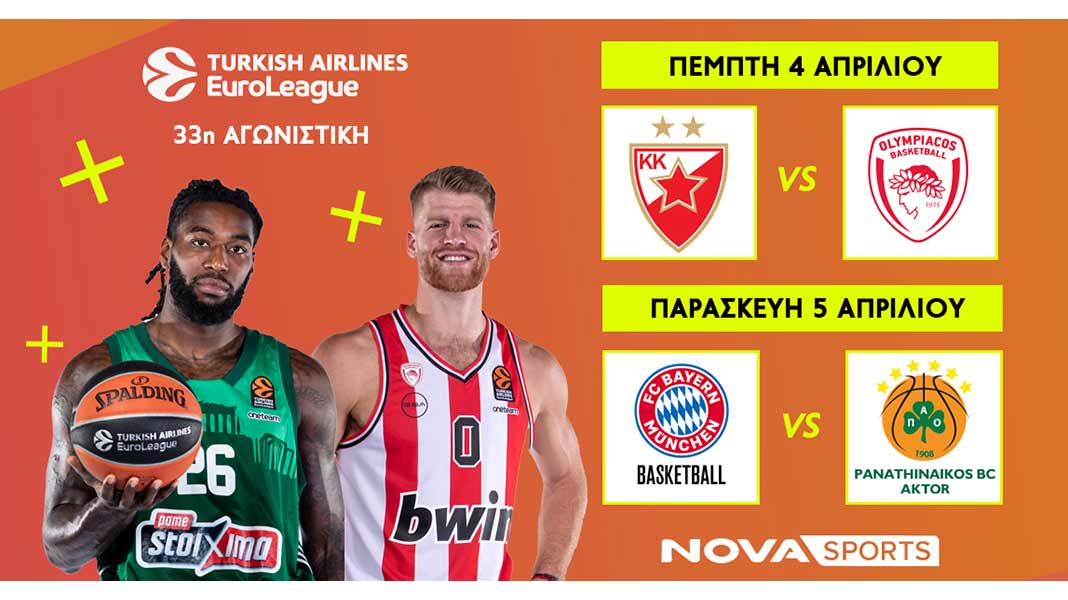 Στην EuroLeague, την κορυφαία ευρωπαϊκή διασυλλογική διοργάνωση στο χώρο του μπάσκετ, το ενδιαφέρον μεγαλώνει για την τελική κατάταξη των ομάδων. Στο πλαίσιο της 33ης και προτελευταίας αγωνιστικής της κανονικής περιόδου τα βλέμματα στρέφονται στις εκτός έδρας αποστολές των ελληνικών ομάδων, Ερυθρός Αστέρας – Ολμπιακός (4/4, 20:00) και Μπάγερν Μονάχου – Παναθηναϊκός AKTOR (5/4, 21:30).