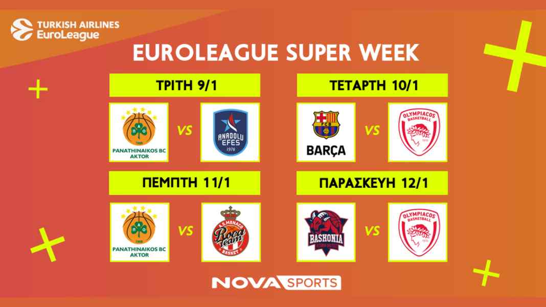 Η «διαβολοβδομάδα»…. Νο6 της EuroLeague είναι εδώ και το Novasports ετοιμάζεται να καλύψει το μπασκετικό υπερθέαμα με τον αρτιότερο τρόπο! Οι φίλοι του μπάσκετ, από την Τρίτη 9 Ιανουαρίου έως και την Παρασκευή 13 Ιανουαρίου θα έχουν την ευκαιρία να απολαύσουν ζωντανά και αποκλειστικά όλους τους αγώνες για την 20η και την 21η αγωνιστική της κορυφαίας ευρωπαϊκής διασυλλογικής διοργάνωσης. Το ενδιαφέρον στρέφεται στις αναμετρήσεις Παναθηναϊκός AKTOR-Αναντολού Εφές (9/1, 21:15) & Μπαρτσελόνα-Ολυμπιακός (10/1, 21:30) για την 20η αγωνιστική, καθώς και Παναθηναϊκός AKTOR-Μονακό (11/1, 21:15) & Μπασκόνια-Ολυμπιακός (12/1, 21:30) για την 21η αγωνιστική.