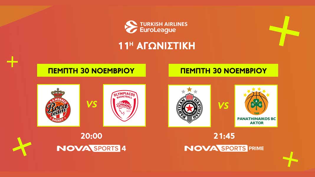 Το μπασκετικό θέαμα στο παρκέ του Novasports με EuroLeague και τους «αιωνίους», με EuroCup και τον Άρη καθώς και με το NCAA συνεχίζεται με αμείωτη ένταση και αυτή την εβδομάδα! Στην EuroLeague, την κορυφαία ευρωπαϊκή διασυλλογική διοργάνωση στο χώρο του μπάσκετ, δεσπόζουν οι αγώνες ελληνικού ενδιαφέροντος Μονακό – Ολυμπιακός (30/11, 20:00) και Παρτίζαν – Παναθηναϊκός AKTOR (30/11, 21:45) στο πλαίσιο της 11ης αγωνιστικής. Παράλληλα, οι φίλοι του μπάσκετ θα απολαύσουν LIVE και όλους τους υπόλοιπους αγώνες της EuroLeague με το ενδιαφέρον να στρέφεται στις αναμετρήσεις Φενέρμπαχτσε – Ρεάλ Μαδρίτης, Μπαρτσελόνα-Βιλερμπάν, Μπάγερν Μονάχου – Βίρτους Μπολόνια, αλλά και στο εξ’ αναβολής παιχνίδι Μακάμπι Τελ Αβιβ – Ρεάλ Μαδρίτης.