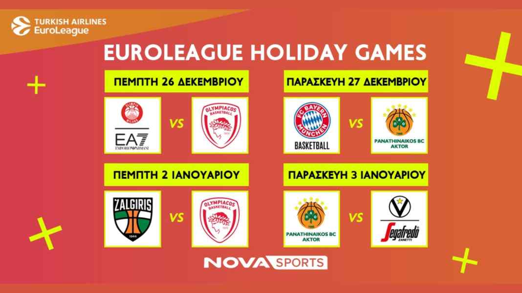 Η EuroLeague, η κορυφαία ευρωπαϊκή διασυλλογική διοργάνωση στο χώρο του μπάσκετ και τις γιορτές συνεχίζει non stop να προσφέρει θέαμα στο παρκέ του Novasports! To ενδιαφέρον των φίλων του μπάσκετ στρέφεται στις αναμετρήσεις Αρμάνι Μιλάνο – Ολυμπιακός (26/12, 21:30) & Μπάγερν Μονάχου – Παναθηναϊκός AKTOR (27/12, 21:30) για την 18η αγωνιστική και Ζαλγκίρις – Ολυμπιακός (2/1, 20:00) & Παναθηναϊκός – Βίρτους Μπολόνια (3/1, 21:15) για την 19η αγωνιστική, στις πρώτες αναμετρήσεις του 2025. Η απόλυτη μπασκετική κπομπή, Playmakers θα μεταφέρει όλα όσα συμβούν με την πληρέστερη και αρτιότερη δημοσιογραφική κάλυψη και εκλεκτούς καλεσμένους.