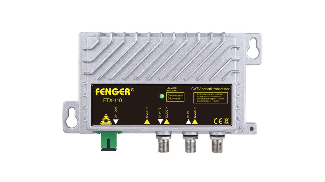 Στα πλαίσια της οπτικής τεχνολογίας, ο Fenger FTX-110 είναι ένας υψηλής απόδοσης οπτικός πομπός CATV 1GHz, ειδικά σχεδιασμένος για δίκτυα HFC και Fiber-To-The-Home. Με μικρό μέγεθος και χαμηλή κατανάλωση, μπορεί να ικανοποιήσει τις απαιτήσεις ενός δικτύου μικρής δομής.