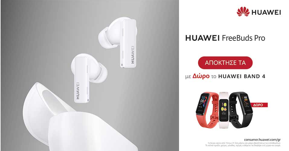 - Τα Huawei FreeBuds Pro διατίθενται από το δίκτυο επίσημων συνεργατών της Huawei (www.teleunicom.com, Cosmote, ΓΕΡΜΑΝΟΣ, ΚΩΤΣΟΒΟΛΟΣ, ΠΛΑΙΣΙΟ, Public, MediaMarkt, Vodafone, WIND, Electronet, You.gr, WelcomeStores, Euronics και Expert Hellas) έως και τις 31 Οκτωβρίου 2020 και μέχρι εξαντλήσεως των αποθεμάτων, με δώρο το Huawei Band 4.