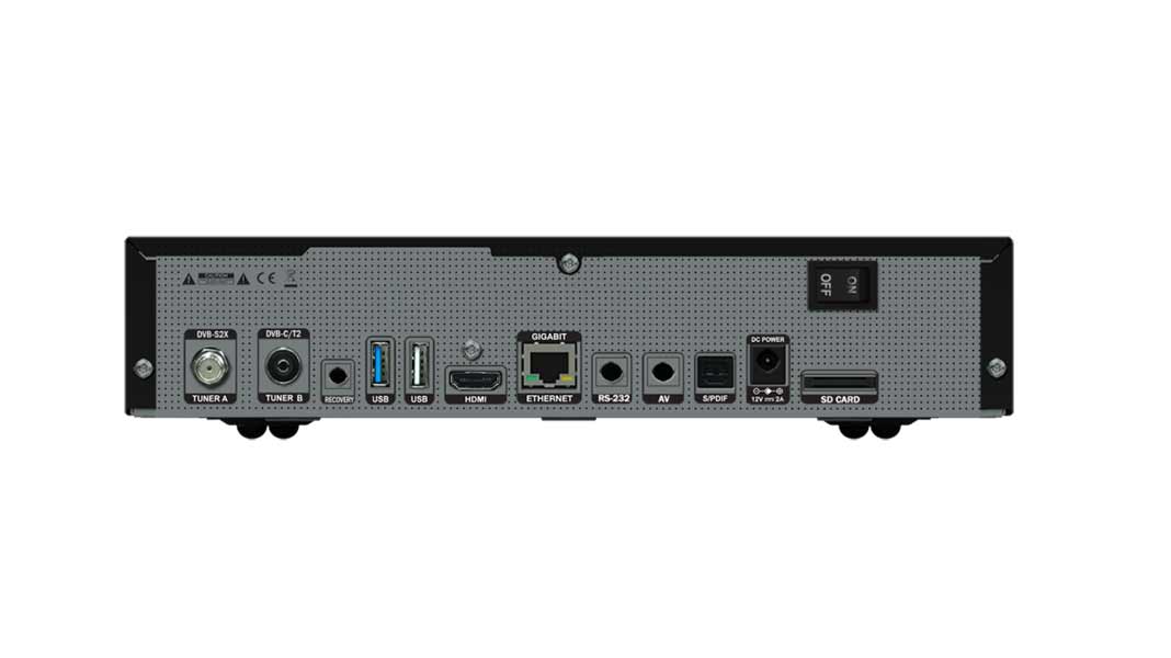 Από πλευράς συνδέσεων στη πίσω όψη, έχουμε 1 x tuner DVB-S2X, 1 x tuner DVB-T2/C, μία οπή recovery, 1 x USB 3.0, 1 x USB 2.0, HDMI 2.0, Gigabit Ethernet, RS-232, έξοδος AV σε mini jack, οπτική έξοδος ψηφιακού ήχου S/PDIF, υποδοχή 12 V για το παρεχόμενο εξωτερικό τροφοδοτικό, υποδοχή SD Card και γενικός διακόπτης τροφοδοσίας.