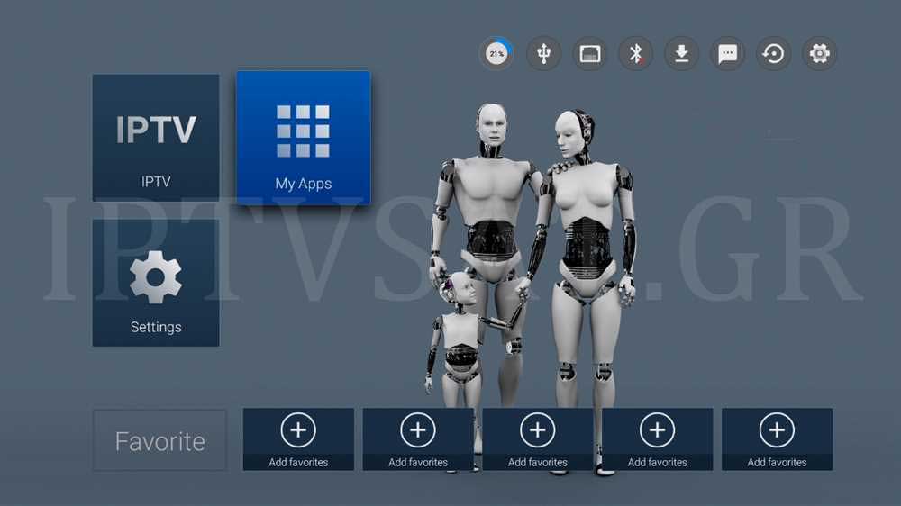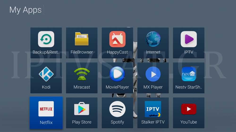 Οι βασικές επιλογές στο κύριο μενού είναι οι: IPTV, MyApps και Settings, ενώ μπορείτε να προσθέσετε μέχρι και 5 αγαπημένες σας εφαρμογές για άμεση πρόσβαση. Με την επιλογή MyApps, εμφανίζονται οι εξής εφαρμογές: Ενημέρωση, Μουσική, Ρυθμίσεις, Συλλογή, Appinstaller, Backup&Restore, FileBrowser, HappyCast, Internet (browser), IPTV, Kodi, Miracast, MoviePLayer, MXPlayer, NeStalker, Nestv StarShop, Netflix, Play Store, Spotify και Youtube. Στην επιλογή IPTV, μπορείτε να εισαγάγετε ένα url που γνωρίζετε για live streaming καναλιών ή να φορτώσετε κάποιο κατάλληλο αρχείο με λίστα καναλιών iptv από αποθηκευτικό μέσο.