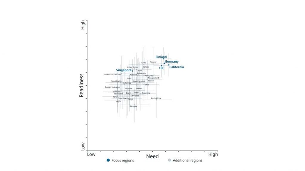 Η μελέτη εστιάζει στη Φινλανδία, τη Γερμανία, τη Σιγκαπούρη, το Ηνωμένο Βασίλειο και την Καλιφόρνια (ΗΠΑ). Αυτές οι περιοχές επιλέχθηκαν επειδή ήταν στην πρώτη γραμμή στην ανάπτυξη και την υιοθέτηση σύγχρονων ενεργειακών τεχνολογιών στο παρελθόν. Η έρευνα διαπίστωσε ότι η Φινλανδία είναι η χώρα με τη μεγαλύτερη ετοιμότητα, εν μέρει λόγω των σχεδίων της για μια ευέλικτη αγορά και την υψηλή τιμή του άνθρακα, ενώ η Καλιφόρνια έχει τη μεγαλύτερη ανάγκη, εν μέρει λόγω της διείσδυσης των ηλιακών συλλεκτών. Από κοντά ακολουθούν η Γερμανία και το Ηνωμένο Βασίλειο, ενώ η Σιγκαπούρη, παρόλο που παρουσιάζει υψηλή ετοιμότητα για grid edge, έχει χαμηλότερη ανάγκη, εν μέρει λόγω των μέτριων φιλοδοξιών για την εισαγωγή ανανεώσιμων πηγών ενέργειας στο μελλοντικό ενεργειακό της μείγμα.
